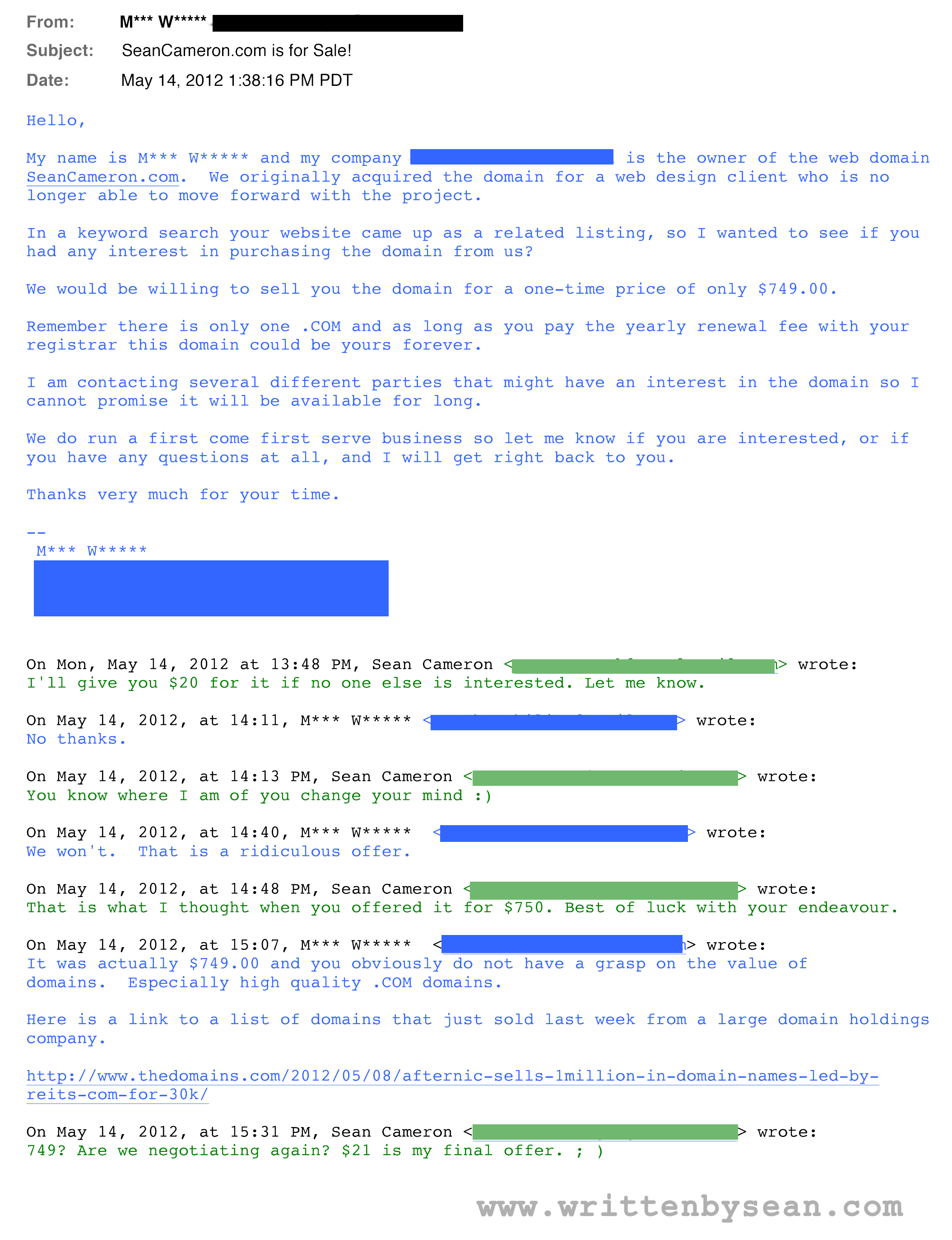RE: seancameron.com is for sale!Sean CameronJun 25, 20121 min readAnyone want to buy seancameron.com for $749? No me neither… But I had fun conversing with the seller.